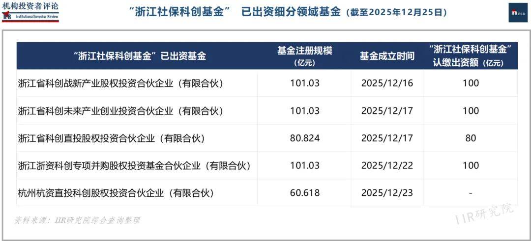 据IIR研究院数据,浙江方面,500亿“浙江社保科创基金”(全称“浙江省社保科创股权投资基金合伙企业(有限合伙)”)已于2025年11月19日完成中基协备案,本月已作为主要出资人陆续出资、设立5支细分基金,分别为:101.03亿元“浙江省科创战新产业基金”、101.03亿元“浙江省科创未来产业基金”、80.824亿元“浙江省科创直投基金”、101.03亿元“浙江浙资科创专项并购基金”,以及60.618亿元“杭州杭资直投科创基金”。