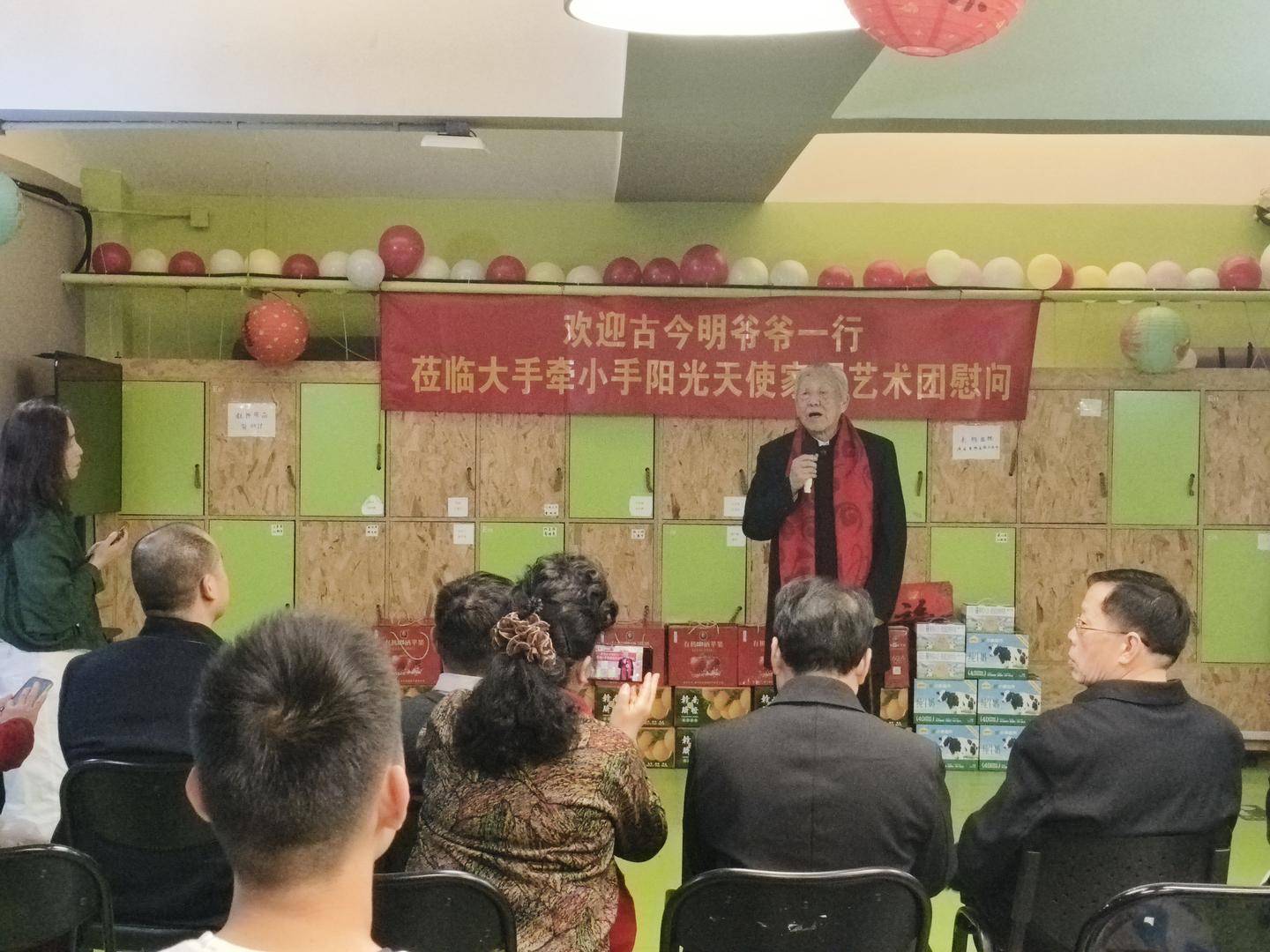 活动现场,欢迎仪式热闹而温馨。小志愿者打起欢快的快板,清脆的节奏瞬间点燃现场氛围;阳光天使家园的星宝们高声欢呼“欢迎古爷爷”,稚嫩的呼喊满是真切的欢喜,更齐声高唱《我爱你中国》,用嘹亮的歌声迎接古今明老先生及爱心慰问团的到来,真挚的心意让现场暖意浓浓。