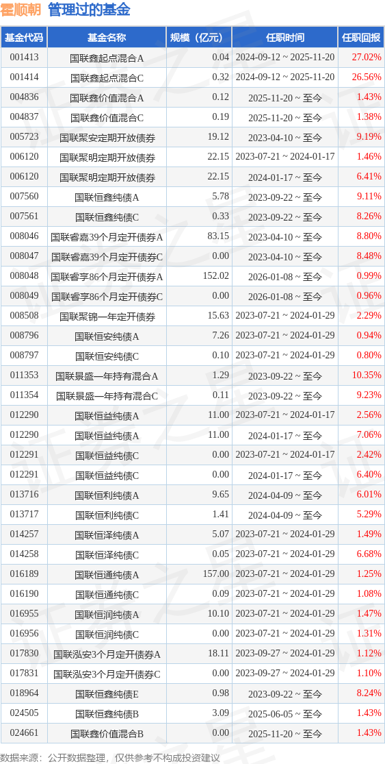 霍顺朝先生:中国国籍,毕业于清华大学经济学专业,研究生、硕士学位,具有基金从业资格。2015年3月至2021年4月,历任国融证券股份有限公司研究员、投资主办、投资顾问授权代表。2021年4月至2023年2月,任建信理财有限责任公司投资经理。2023年3月加入中融基金管理有限公司,现任固收投资部基金经理。2023年4月10日起任中融睿嘉39个月定期开放债券型证券投资基金的基金经理。2023年4月10日起任国联聚安3个月定期开放债券型发起式证券投资基金的基金经理。2023年09月22日起任国联恒鑫纯债债券型证券投资基金基金经理。2023年9月22日任国联景盛一年持有期混合型证券投资基金基金经理。2024年01月17日担任国联恒益纯债债券型证券投资基金基金经理、国联聚明3个月定期开放债券型发起式证券投资基金基金经理。2024年04月09日起任国联恒利纯债债券型证券投资基金的基金经理。2024年9月12日至2025年11月20日任国联鑫起点灵活配置混合型证券投资基金的基金经理。2025年11月20日起任国联鑫价值灵活配置混合型证券投资基金基金经理。2026年1月8日担任国联睿享86个月定期开放债券型证券投资基金基金经理。