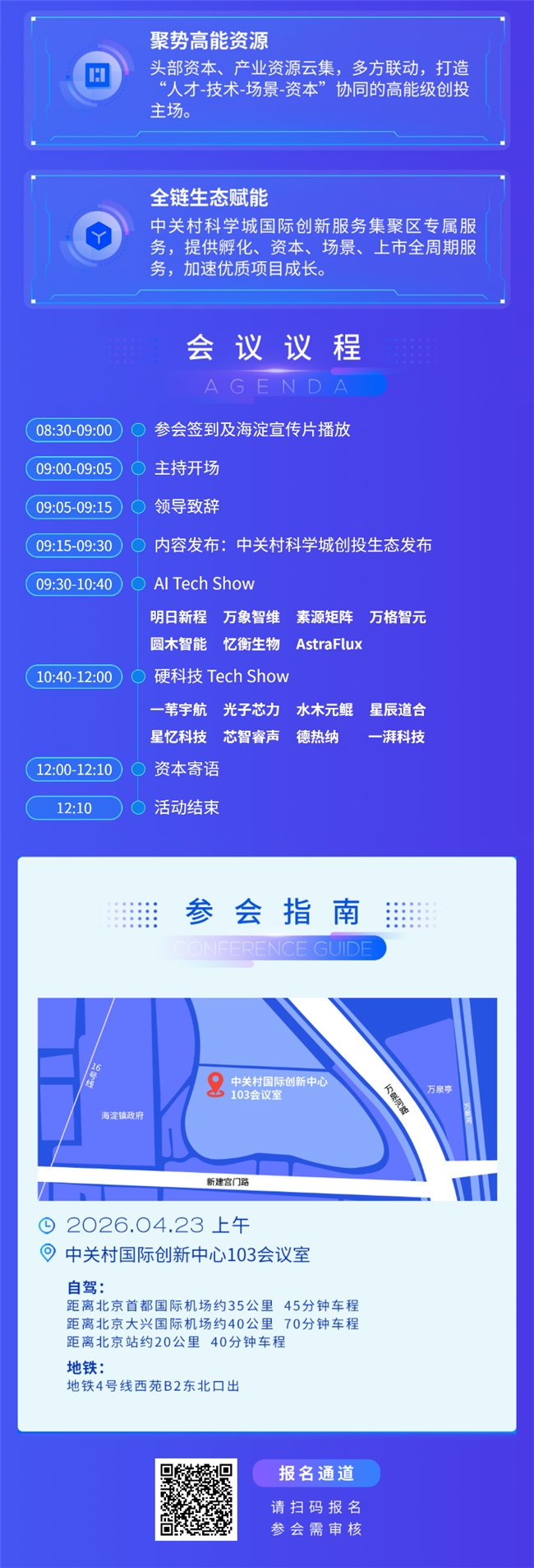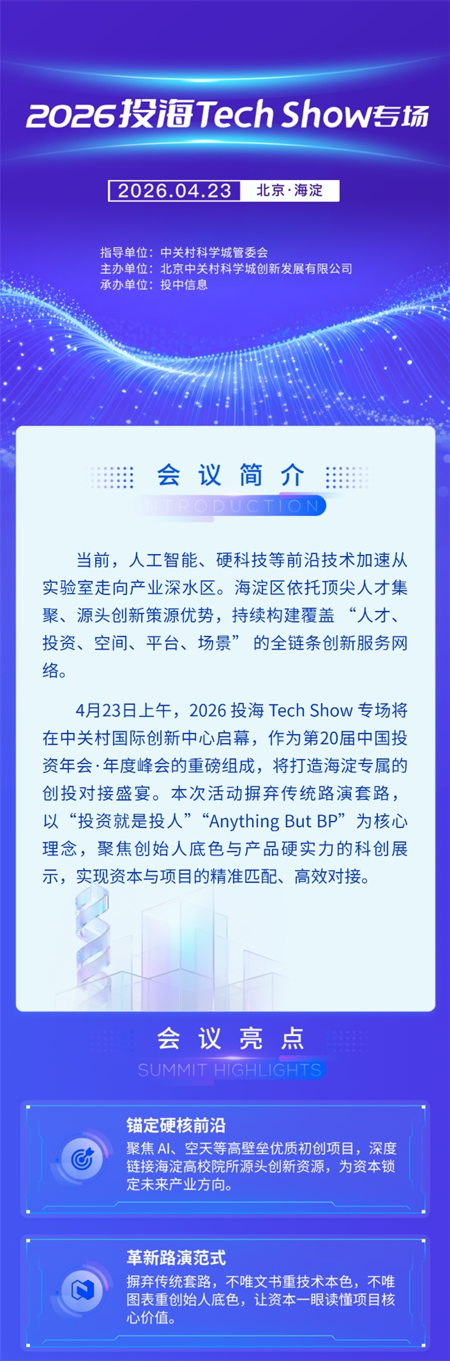 本次“2026投海Tech Show专场”活动由中关村科学城管委会指导、北京中关村科学城创新发展有限公司主办、投中信息承办,也是“第20届中国投资年会·年度峰会”的重要组成部分。届时,东方富海、中信资本、复星锐正资本、众为资本、水木创投、长石资本、元禾厚望、星连资本、水木清华校友种子基金等多家知名机构合伙人将到场担任评委。活动最后还将设置“资本寄语”环节,由投资大咖从市场化视角给出整体建议。
